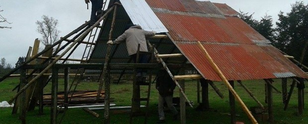 Entre lluvia, viento, intenso frió… sol a ratos y arco iris que cruzan todo el cielo sobre el territorio de pilmaken, continua la resistencia en el espacio sagrado mapuche williche….Hoy los encontramos, buscando materiales para terminar la construcción de la ruca, espacio colectivo que reafirma el control territorial que llevan adelante los weichafe o defensores del pilmaiken, a pesar del complicado clima de la zona la resistencia continua, los trabajos abundan, no hay descanso cuando se trata de mantener viva la defensa del espacio sagrado del gne kintuante… volvemos a ver el campamento un como mas tapado que en verano, pero solo para impedir que la lluvia moje el único espacio que existe para poder dormir, pero en general se compone de lo mismo… unos cuantos palos con plásticos como techo y paredes.